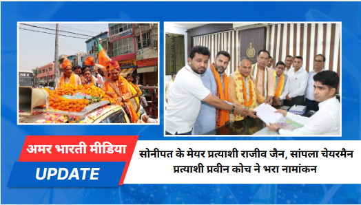 चंडीगढ़, 24 अप्रैल। भाजपा प्रदेश अध्यक्ष पंडित मोहन लाल बड़ौली ने शुक्रवार को सोनीपत निगम के मेयर प्रत्याशी राजीव जैन और रोहतक के सांपला नगर पालिका के चेयरमैन पद के प्रत्याशी प्रवीन कोच का विधिवत नामांकन भरवाया। नामांकन के दौरान सोनीपत और सांपला में भव्य रोड शो का आयोजन हुआ।