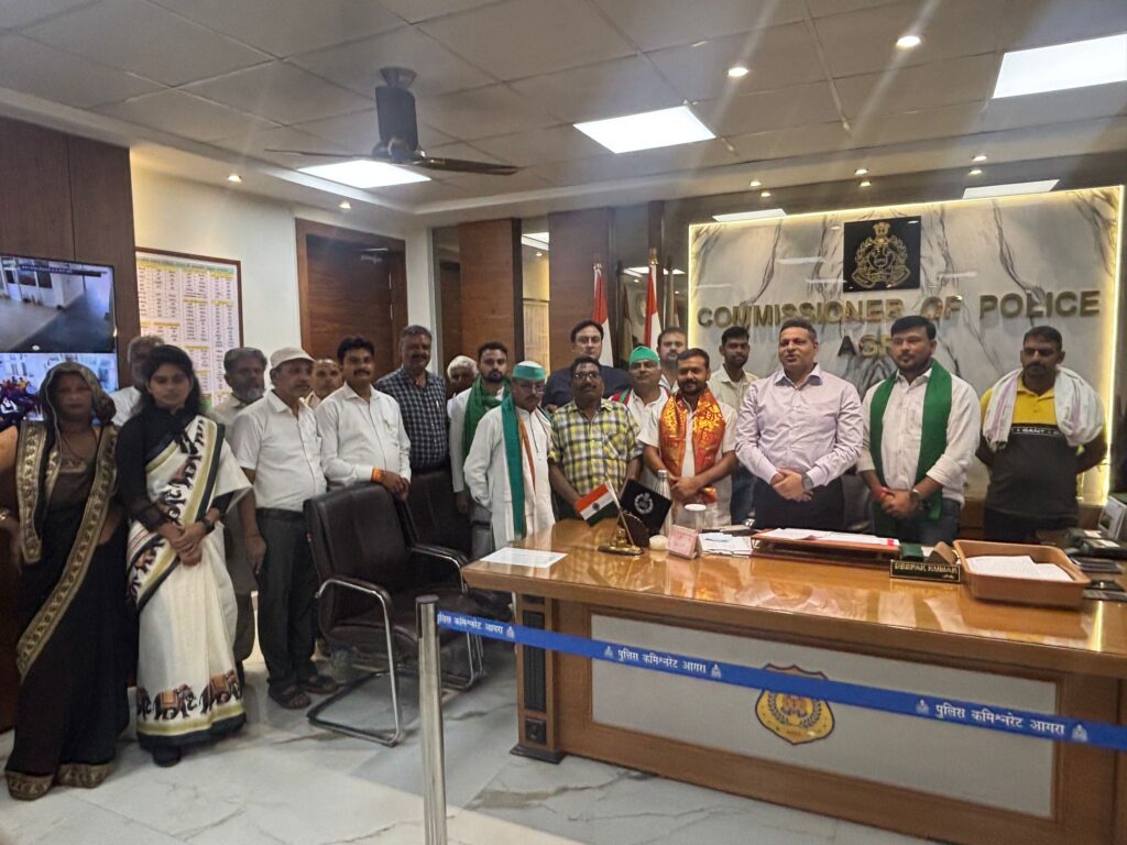 आगरा। किसान मजदूर नेता चौधरी दिलीप सिंह के साथ थाना प्रभारी द्वारा अभद्रता किए जाने के मामले में प्रतिनिधिमंडल ने पुलिस आयुक्त को ज्ञापन सौंपकर न्याय की मांग की है। ज्ञापन में थाना प्रभारी प्रदीप कुमार त्रिपाठी के खिलाफ जांच कर कार्रवाई करने की मांग की गई।