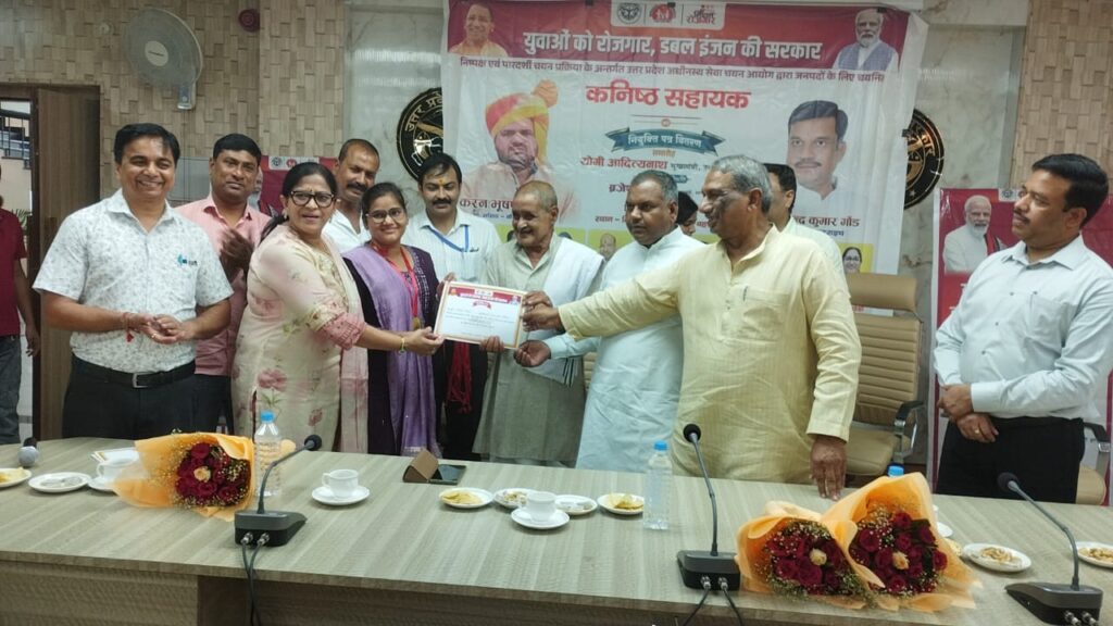 बहराइच: उत्तर प्रदेश अधीनस्थ सेवा चयन आयोग द्वारा निष्पक्ष और पारदर्शी चयन प्रक्रिया के तहत चयनित सात कनिष्ठ सहायकों को नियुक्ति पत्र वितरित किया गया। यह कार्यक्रम लोक भवन स्थित विकास भवन सभागार में आयोजित किया गया, जिसमें मा. मुख्यमंत्री योगी आदित्यनाथ जी द्वारा नियुक्ति पत्र वितरण का सजीव प्रसारण किया गया।
