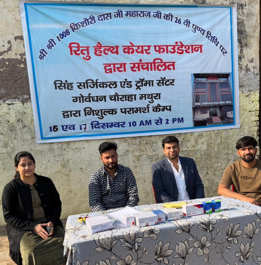 चौमुंहा। चौमुंहा ब्लॉक के अंतर्गत गांव अकबरपुर स्थित अनाथ गौशाला गोपाल जी मंदिर परिसर में श्री किशोरीदास जी महाराज की पुण्यतिथि के पावन अवसर पर आयोजित श्रीमद् भागवत कथा के दौरान समाज सेवा की एक सराहनीय पहल देखने को मिली। धार्मिक आयोजन के साथ-साथ रितु हेल्थ फाउंडेशन, सिंह सर्जिकल एंड ट्रामा सेंटर, गोवर्धन चौराहा (मथुरा) की ओर से दो दिवसीय निःशुल्क स्वास्थ्य परामर्श शिविर का आयोजन किया गया।