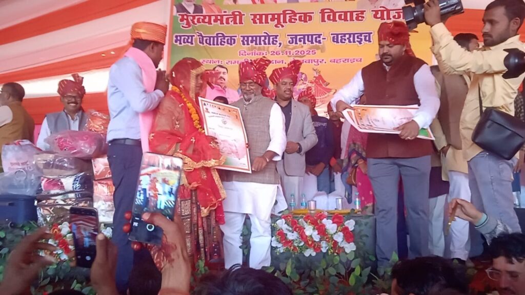बहराइच। मुख्यमंत्री सामूहिक विवाह योजना के अंतर्गत विकास खंड तेजवापुर के रामलीला मैदान में आयोजित सामूहिक विवाह समारोह में 460 गरीब कन्याओं का विवाह सम्पन्न हुआ। इनमें 61 मुस्लिम जोड़ों का निकाह तथा 399 हिंदू जोड़ों का विवाह हिंदू रीति-रिवाजों के अनुसार संपन्न कराया गया। कार्यक्रम में जनपद के सभी विकासखंडों व नगरीय निकायों के अंतर्गत आने वाले जोड़ों का विवाह एक ही मंच पर सम्पन्न हुआ।