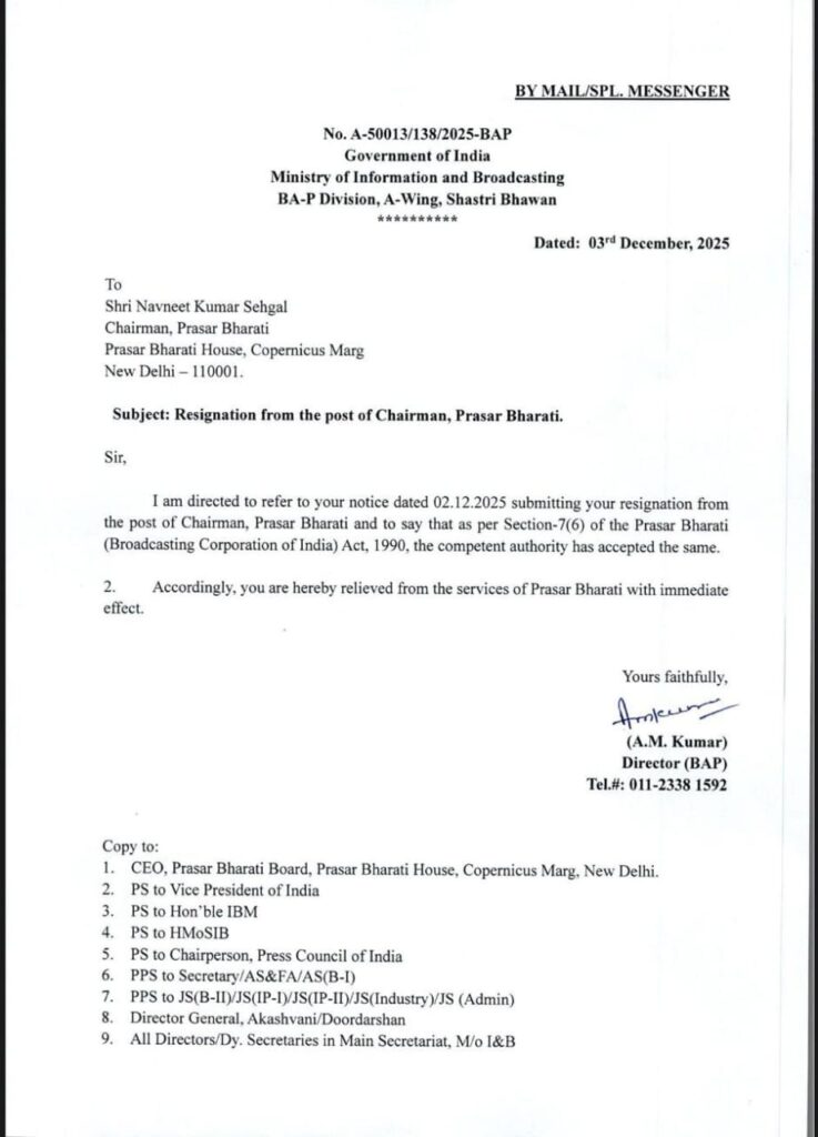 सूचना एवं प्रसारण मंत्रालय ने उनके इस्तीफे को प्रसार भारती अधिनियम, 1990 की धारा 7(6) के तहत स्वीकार कर लिया और उन्हें तत्काल प्रभाव से पद से मुक्त कर दिया।