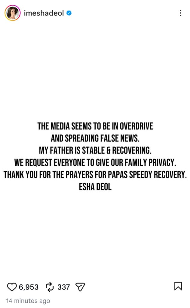 हालाँकि ईशा देओल ने धर्मेंद्र की मौत को अफवाह बताया है ।