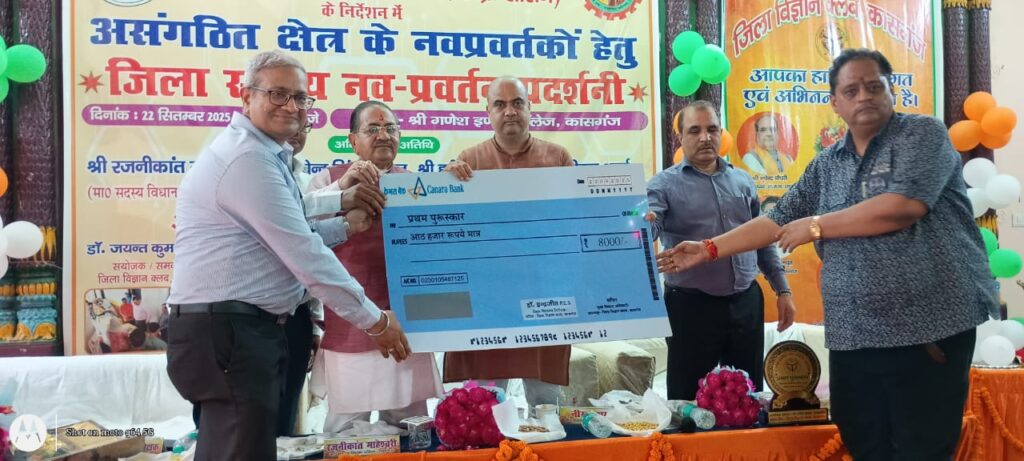 कासगंज।विज्ञान एवं प्रौद्योगिकी विभाग उत्तर प्रदेश शासन तथा जिलाधिकारी प्रणय सिंह के निर्देशन और मुख्य विकास अधिकारी सचिन के मार्गदर्शन में जिला विज्ञान क्लब द्वारा आयोजित जिला स्तरीय नव प्रवर्तन प्रदर्शनी में आशीष गोयल के तकनीकी नवाचारी मॉडल ऑटोमेटिक लिक्विड फिलिंग मशीन ने प्रथम स्थान हासिल किया। उन्हें 8,000 रुपए की धनराशि का चेक, प्रशस्ति पत्र और स्मृति चिन्ह देकर सम्मानित किया गया।