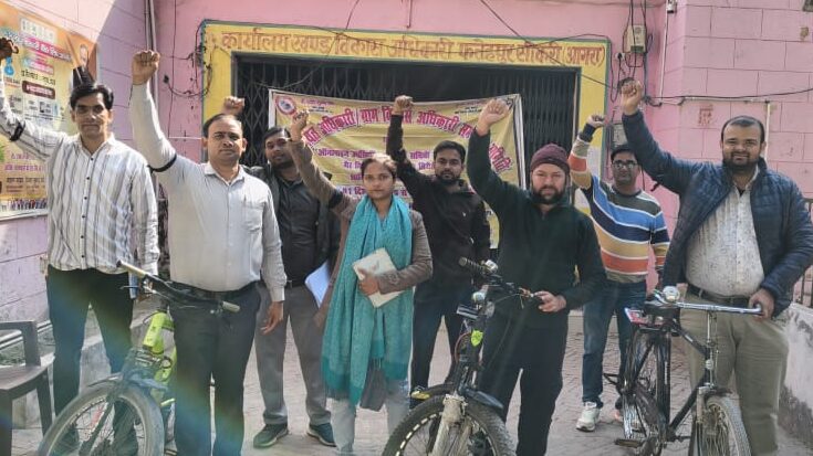 फतेहपुर सीकरी। ग्राम पंचायत एवं विकास अधिकारी संघ के प्रांतीय नेतृत्व के आवाहन पर 10 दिन से चल रहे सत्याग्रह आंदोलन के 10वें दिन ग्राम सचिवों ने साइकिल से अपने क्षेत्र में कार्य किया।