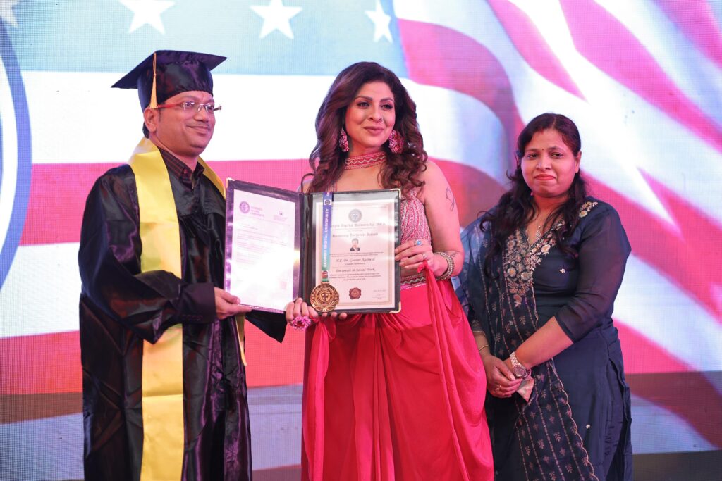 सम्मान समारोह देर शाम लखनऊ के गोल्डन ट्यूलिप होटल के सभागार में आयोजित किया गया। इस अवसर पर यूनिवर्सिटी के प्रोफेसर, आयोजक आशीष गौड़ और प्रेरणा जैन के साथ ही बालीवुड अभिनेत्री तन्नाज ईरानी ने गौरव अग्रवाल को प्रमाणपत्र और मेडल प्रदान किया।