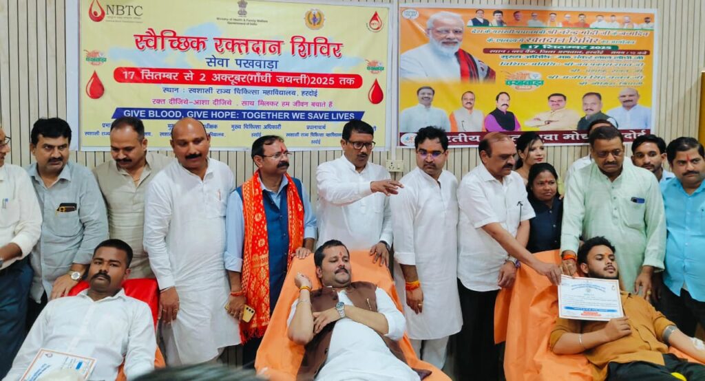 हरदोई। प्रधानमंत्री नरेंद्र मोदी के 75वें जन्मदिवस के अवसर पर हरदोई में युवा मोर्चा द्वारा विशेष रक्तदान शिविर का आयोजन किया गया। इस अवसर पर युवाओं ने 75 यूनिट रक्तदान कर प्रधानमंत्री की 75वीं वर्षगांठ को सम्मानित किया।