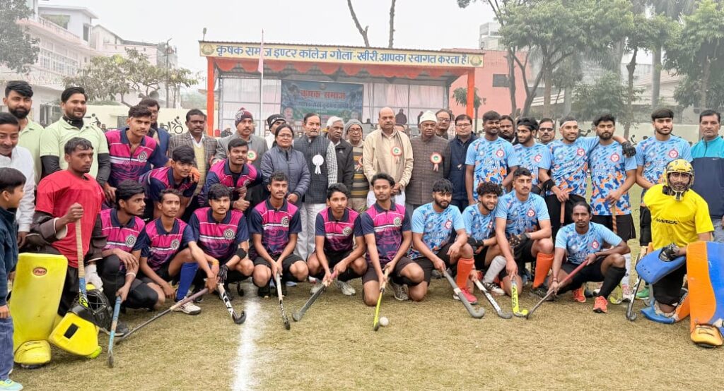 गोला, गोकर्णनाथ-खीरी। कृषक समाज इंटर कॉलेज में आयोजित 63वें प्रादेशिक हॉकी टूर्नामेंट का उद्घाटन समारोह हर्षोल्लास के साथ सम्पन्न हुआ। उद्घाटन के अवसर पर मुख्य अतिथि विजय शुक्ला, रिंकू नगर पालिका अध्यक्ष, और विशिष्ट अतिथि रवि प्रकाश वर्मा, पूर्व सांसद, ने खिलाड़ियों का परिचय करवाते हुए मैचों का उद्घाटन किया।