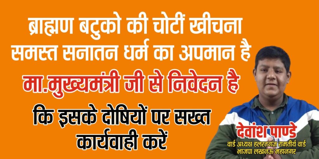 भाजपा लखनऊ महानगर के वार्ड अध्यक्ष देवांश पाण्डे द्वारा लगाए गए पोस्टरों में मुख्यमंत्री से दोषियों पर कड़ी कार्रवाई की अपील की गई है। पोस्टर वार के जरिए ब्राह्मण समाज के सम्मान और सुरक्षा का मुद्दा प्रमुखता से उठाया गया है।
