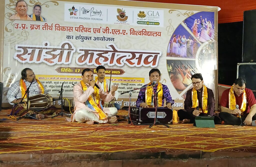 मथुरा। उत्तर प्रदेश ब्रज तीर्थ विकास परिषद एवं जी.एल.ए. विश्वविद्यालय के संयुक्त तत्वावधान में चल रहे सांझी महोत्सव-2025 के अंतर्गत रसखान समाधि के मुक्ताकाशीय मंच पर गुरुवार की रात एक अविस्मरणीय भजन संध्या का आयोजन हुआ।