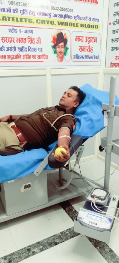 प्रयागराज। संगम नगरी के एक दरोगा ने नवजात बेबी को रक्तदान कर इंसानियत की मिसाल पेश की। उनके ब्लड डोनेट करने से नवजात की जान बचाई जा सकी। जानकारी के मुताबिक प्रयागराज शहर से लगे यमुनापार के औद्योगिक क्षेत्र थाने के प्रभारी विपिन पाल सिंह को शनिवार रात करीब एक बजे प्रयागराज के बार्डर लालगोपालगंज से उनके एक परिचित ने फोन कर मदद मांगी और कहा कि कमला नेहरू अस्पताल में उनके एक परिचित हैं जिनकी पत्नी को प्री-मैच्योर बेबी पैदा हुई है। उसे वेंटीलेटर में रखा गया है। खून चढ़ाना जरूरी है। किसी तरह खून की व्यवस्था करा दीजिए। परिचित के कहने पर रात में ही उन्होने कई जगह फोन किया लेकिन कहीं से सकारात्मक उत्तर नहीं मिला। इसपर उन्होने खुद ही खून देने का फैसला किया और रात में ही चलकर शहर के स्वरूप रानी नेहरू अस्पताल पहुंचे। वहां पहुंच कर उन्होने ब्लड डोनेट किया जिससे नवजात की जान बचाई जा सकी। उनकी इस नेकनियती की चर्चा सोशल मीडिया पर जमकर वायरल हो रही है। नवजात बेबी का परिवार शहर के ममफोर्डगंज इलाके में रहता है। थाना प्रभारी विपिन पाल सिंह ने बताया कि बेबी के परिवार को वह पहचानते नहीं लेकिन उनकी मदद कर मुझे आत्मिक शांति मिली है। उसको शब्दों में बयां नहीं कर सकता।