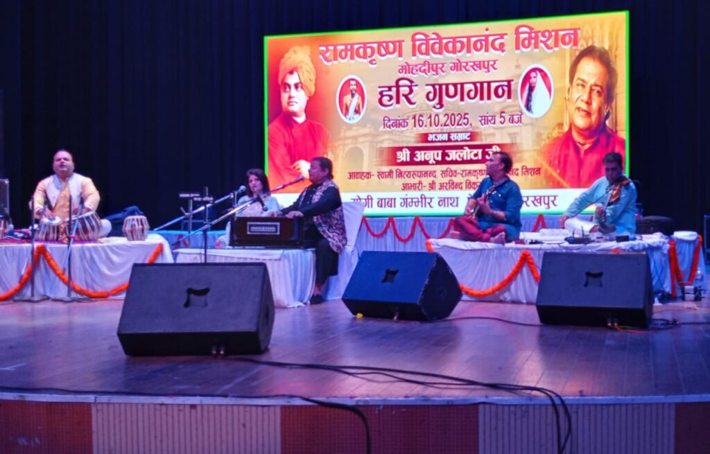 गोरखपुर, 16 अक्टूबर रामकृष्ण विवेकानंद मिशन, गोरखपुर के स्वर्ण जयंती वर्ष के उपलक्ष्य में एक भव्य भजन संध्या का आयोजन किया गया, जिसमें सुप्रसिद्ध भजन सम्राट अनूप जलोटा ने अपनी मधुर आवाज़ से भक्तिमय वातावरण तैयार कर दिया। कार्यक्रम का शुभारंभ दीप प्रज्ज्वलन से हुआ, जिसके बाद मंच का संचालन मिशन के उपाध्यक्ष अरविंद विक्रम ने किया। उन्होंने स्वागत उद्बोधन देते हुए मिशन की गतिविधियों और सामाजिक योगदान पर विस्तार से प्रकाश डाला।