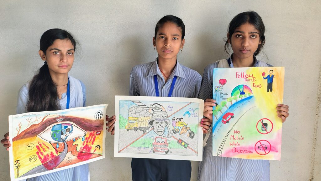 विद्यार्थियों ने अपने पोस्टरों के माध्यम से सड़क सुरक्षा, हेलमेट के महत्व, सीट बेल्ट के उपयोग और नशामुक्त वाहन चलाने जैसे महत्वपूर्ण संदेश दिए।