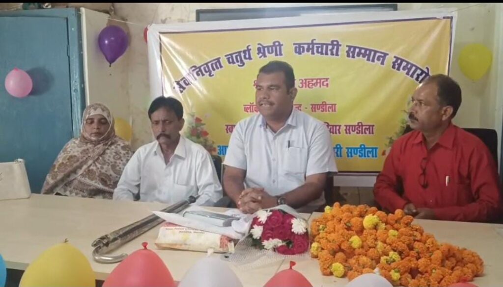 संडीला (हरदोई)। संडीला ब्लॉक रिसोर्स सेंटर (बी.आर.सी.) पर कार्यरत चतुर्थ श्रेणी कर्मी वकील अहमद के 30 सितंबर 2025 को सेवानिवृत्त होने पर उनके सम्मान में भव्य विदाई समारोह का आयोजन किया गया। इस अवसर पर सहयोगियों और अधिकारियों ने उनके समर्पित कार्यकाल की सराहना करते हुए उन्हें माला पहनाकर, अंगवस्त्र, कुरान और उपहार भेंट कर सम्मानित किया।