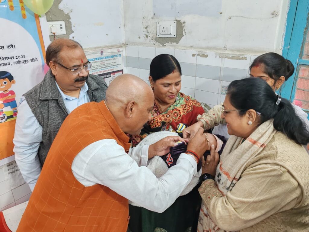 लखीमपुर खीरी। नियमित एवं छूटे हुए बच्चों और गर्भवती माताओं के टीकाकरण को सुनिश्चित करने के लिए चलाए जा रहे विशेष टीकाकरण अभियान “टीकोत्सव” का शुभारंभ सदर विधायक योगेश वर्मा ने जिला महिला चिकित्सालय में फीता काटकर एवं नवजात शिशुओं को पोलियो की ड्रॉप पिलाकर किया।