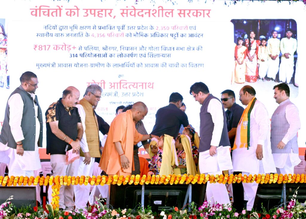 मुख्यमंत्री योगी ने चंदन चौकी (पलिया) में आयोजित कार्यक्रम में नदियों द्वारा भूमि क्षरण से प्रभावित पूर्वी उत्तर प्रदेश के 2350 परिवारों व थारू जनजाति के 4356 परिवारों को भौमिक अधिकार पट्टों का आवंटन किया और पलिया, श्रीनगर, निघासन व गोला गोकर्णनाथ विधानसभा क्षेत्रों की 817 करोड़ रुपये की 314 विकास परियोजनाओं का लोकार्पण/शिलान्यास किया। सीएम ने थारू जनजाति के कलाकारों की सांस्कृतिक प्रस्तुति देखी और अपनी संस्कृति को बचाकर रखने के लिए उनकी सराहना भी की।