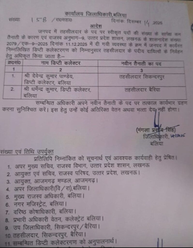 उत्तर प्रदेश से एक बड़ी और ऐतिहासिक प्रशासनिक खबर सामने आई है। बलिया के जिलाधिकारी एवं IAS अधिकारी मंगला प्रसाद सिंह ने राजस्व परिषद उत्तर प्रदेश के आदेश के अनुपालन में बड़ा फैसला लेते हुए दो उपजिलाधिकारियों (SDM) को तहसीलदार के पद पर तैनात कर दिया है। यह उत्तर प्रदेश में अपनी तरह का पहला मामला माना जा रहा है, जब SDM स्तर के अधिकारियों को सीधे तहसीलदार की जिम्मेदारी सौंपी गई है।
