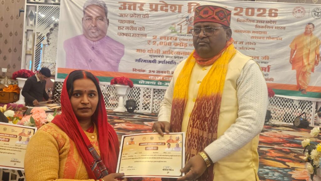 फतेहपुर-बाराबंकी। उत्तर प्रदेश के स्थापना दिवस के अवसर पर क्षेत्र के बाबा लॉन में भव्य समारोह का आयोजन किया गया। कार्यक्रम में मुख्य अतिथि विधायक साकेंद्र प्रताप वर्मा एवं एसडीएम कार्तिकेय सिंह की गरिमामयी उपस्थिति रही। इस अवसर पर विधायक द्वारा प्रधानमंत्री निशुल्क आवास योजना के अंतर्गत 322 लाभार्थियों को स्वीकृति पत्र वितरित किए गए। कार्यक्रम का शुभारंभ राष्ट्रगान के साथ हुआ, जिसमें बड़ी संख्या में उपस्थित लोगों ने खड़े होकर राष्ट्रगान किया।