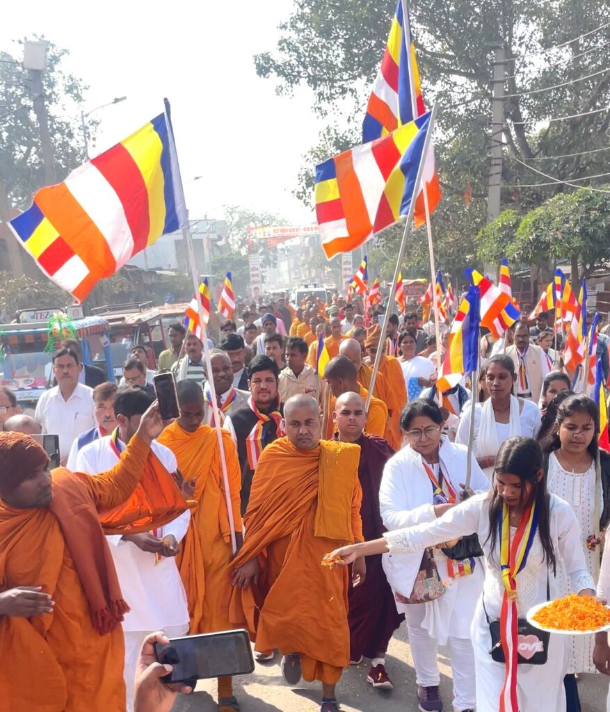 कछौना/हरदोई: करुणा, मैत्री और विश्व शांति का संदेश लेकर सारनाथ से संकिसा तक 600 किमी की धम्म चारिका (शांति यात्रा) पर निकले पूज्य भिक्खु चंदिमा महाथेरो के नेतृत्व में लगभग 100 सदस्यीय पावन भिक्खु महासंघ का रविवार (7 दिसंबर) को कछौना कस्बे में भव्य स्वागत किया गया। बहुजन बुद्ध विहार, कुकुही—कछौना में उपासकों द्वारा भोजन दान व संघ दान अर्पित किया गया।