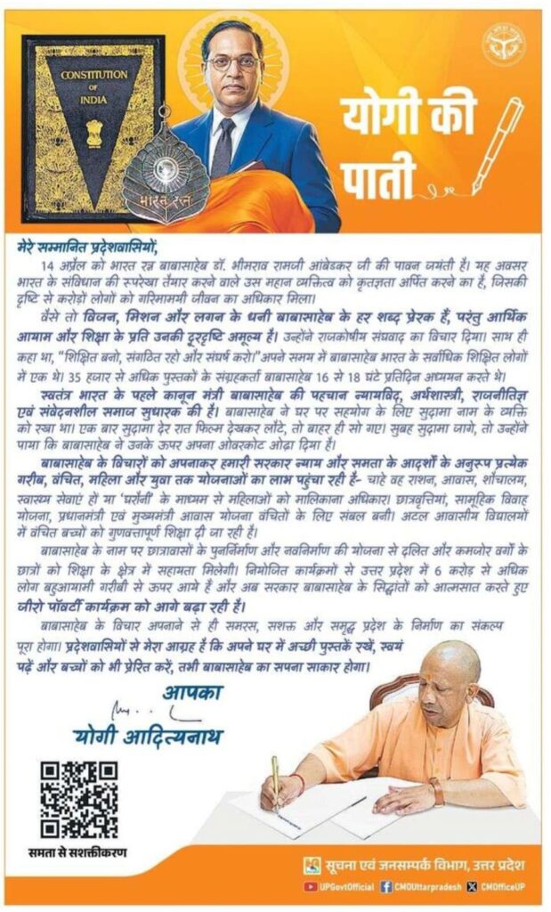 आंबेडकर जयंती पर सीएम योगी की चिट्ठी: “शिक्षित बनो, संगठित रहो, संघर्ष करो” का दिया संदेश