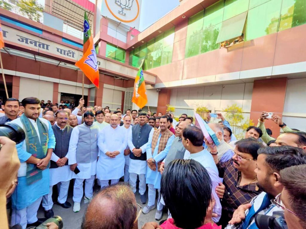 बिहार चुनाव में राजग गठबंधन की जीत के बाद बड़ी संख्या में कार्यकर्ता पार्टी मुख्यालय पहुंचे। ढोल-नगाड़ों की थाप पर नाचते-गाते हुए उन्होंने अपनी खुशी का इज़हार किया। जीत की उमंग में कार्यकर्ताओं ने आतिशबाज़ी की और एक-दूसरे को मिठाई खिलाकर “बिहार में विजय” की शुभकामनाएँ दी।